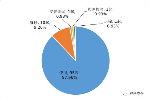按发生环节划分,发生在使用环节95起,占87.96%,维修环节10起,占9.26%,安装调试环节1起,占0.93%,检验检测环节1起,占0.93%。运输环节1起,占0.93%。(见图5)