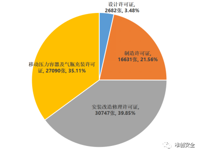 截至2022年年底,全国共有特种设备生产(含设计、制造、安装、改造、修理)和充装单位75689家,持有许可证77150张,其中:设计许可证2682张,制造许可证16631张,安装改造修理许可证30747张,移动式压力容器及气瓶充装许可证27090张。(见图2)