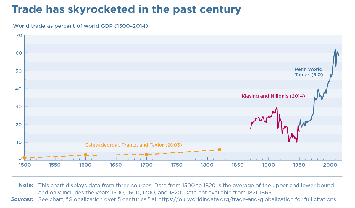 自古以来,由于技术和交通的进步,人类一直在寻找遥远的地方定居、生产和交换商品。但直到 19 世纪,全球一体化才开始起步。经过几个世纪的欧洲殖民和贸易活动,第一波全球化“浪潮”是由轮船、铁路、电报和其他突破以及各国之间日益增强的经济合作推动的。全球化趋势最终在第一次世界大战的灾难中减弱和崩溃,随后是战后保护主义、大萧条和第二次世界大战。20 世纪 40 年代中期第二次世界大战后,美国在商定的基本规则下带头重振国际贸易和投资,开启了第二波全球化浪潮,尽管受到周期性经济衰退和日益严格的政治审查的冲击,但这一浪潮仍在持续。