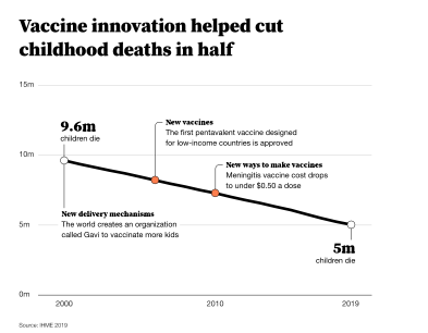 不过,我最喜欢的创新故事是从我最喜欢的统计数据之一开始的:自 2000 年以来,世界五岁前死亡的儿童人数减少了一半。