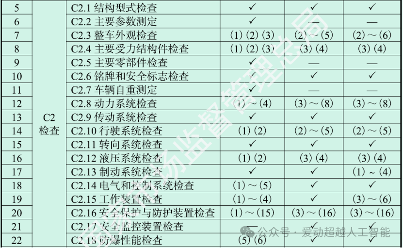 看到这里大家可能会想,钥匙、密码、磁卡?这装个密码机、刷卡机还不简单吗?所谓的“司机权限信息采集器”该不会就是个噱头吧。然而,并不全面!实际上,咱们要满足的是TSG 81规程全文中对咱叉车的要求,如果更直观地掌握全部要求,我们可以看TSG 81规程附录c所提供的“叉车检验项目表”。
