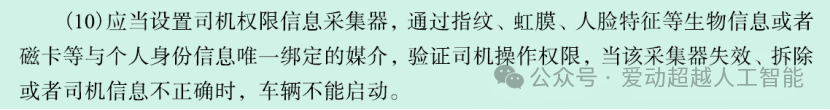 原文文本版:“应当设置司机权限信息采集器,通过指纹、虹膜、人脸特征等生物信息或者磁卡等与个人身份信息唯一绑定的媒介,验证司机操作权限,当该采集器失效、拆除或者司机信息不正确时,车辆不能启动。”