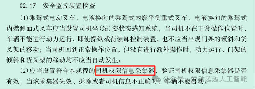而“司机权限信息采集器”在TSG 81规程当中当然是有明确要求的,请看下文对应“叉车检验项目表”C2.17安全监控装置检查项目的要求:
