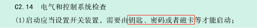 在“叉车检验项目表”中,我们可以看到,提及“钥匙、密码或者磁卡”的是C2.14电气和控制系统检查这一项,也就是说,安装例如密码机、刷卡机只能满足该项检查的要求,不能错认为覆盖到全部检查项目的要求。