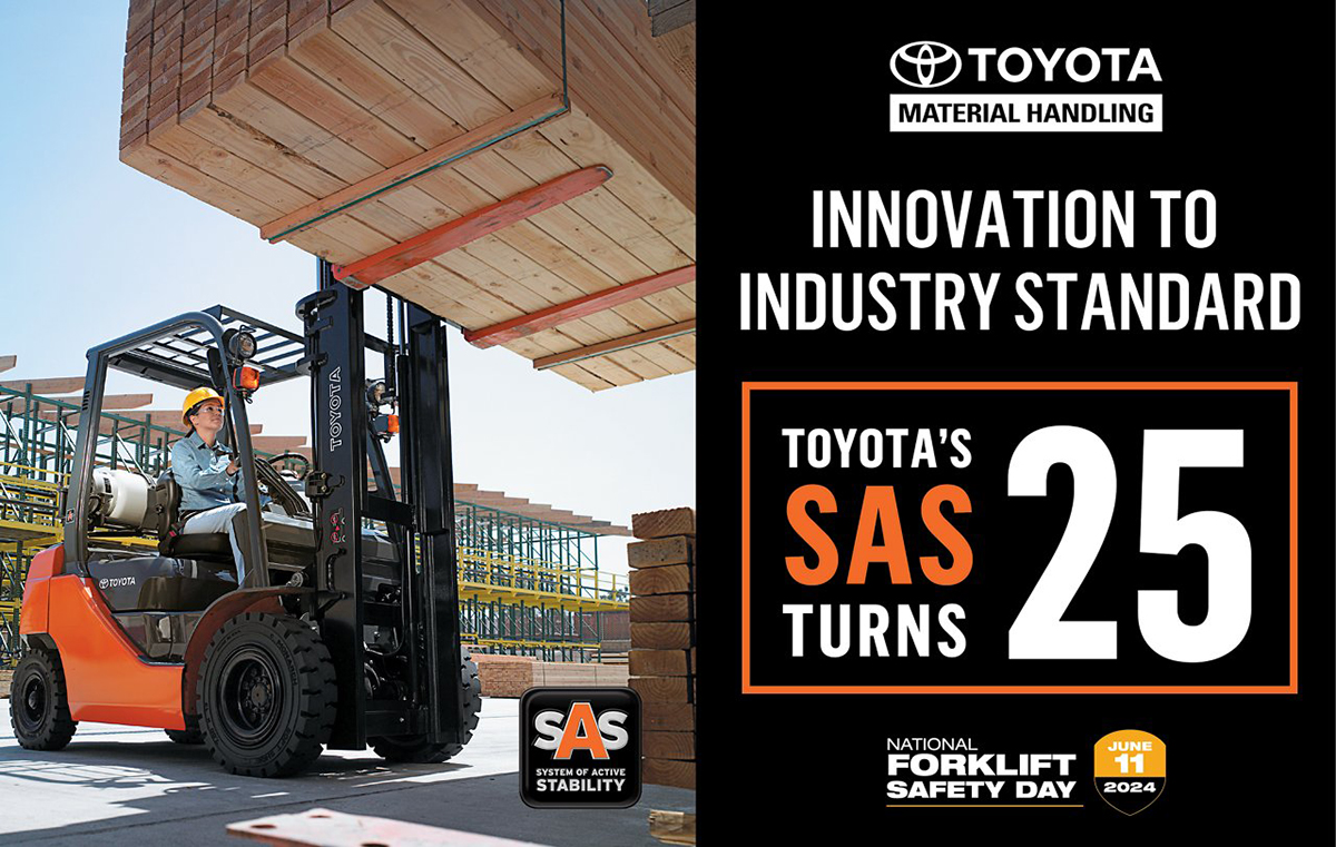 6月上旬,丰田物料搬运(Toyota Material Handling, TMH)在第十一届全国叉车安全日(National Forklift Safety Day)上庆祝其开创性的主动稳定系统(System of Active Stability™, SAS)25周年。全国叉车安全日由美国工业车辆协会(Industrial Truck Association, ITA)赞助,每年一度,旨在提升叉车操作员的安全意识和技能,并教育客户、政策制定者和政府官员有关叉车安全使用的重要性。