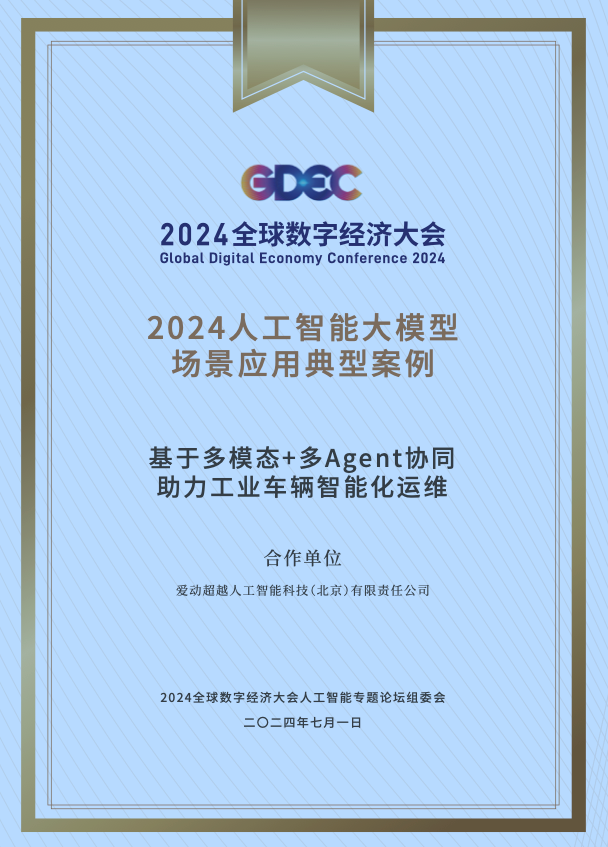 7月1日,2024全球数字经济大会人工智能专题论坛在中关村国家自主创新示范区会议中心成功召开。本次论坛以“应用即未来——大模型赋能千行百业,新生态拥抱产业未来”为主题,汇聚了政府、企业和学术界的专家,共同探讨大模型技术在各行业中的应用。论坛上,备受瞩目的“2024人工智能大模型场景应用典型案例”正式发布,其中爱动超越开发的“基于多模态+多Agent协同助力工业车辆智能化运维场景应用”成功入围,成为这一领域的耀眼明星。