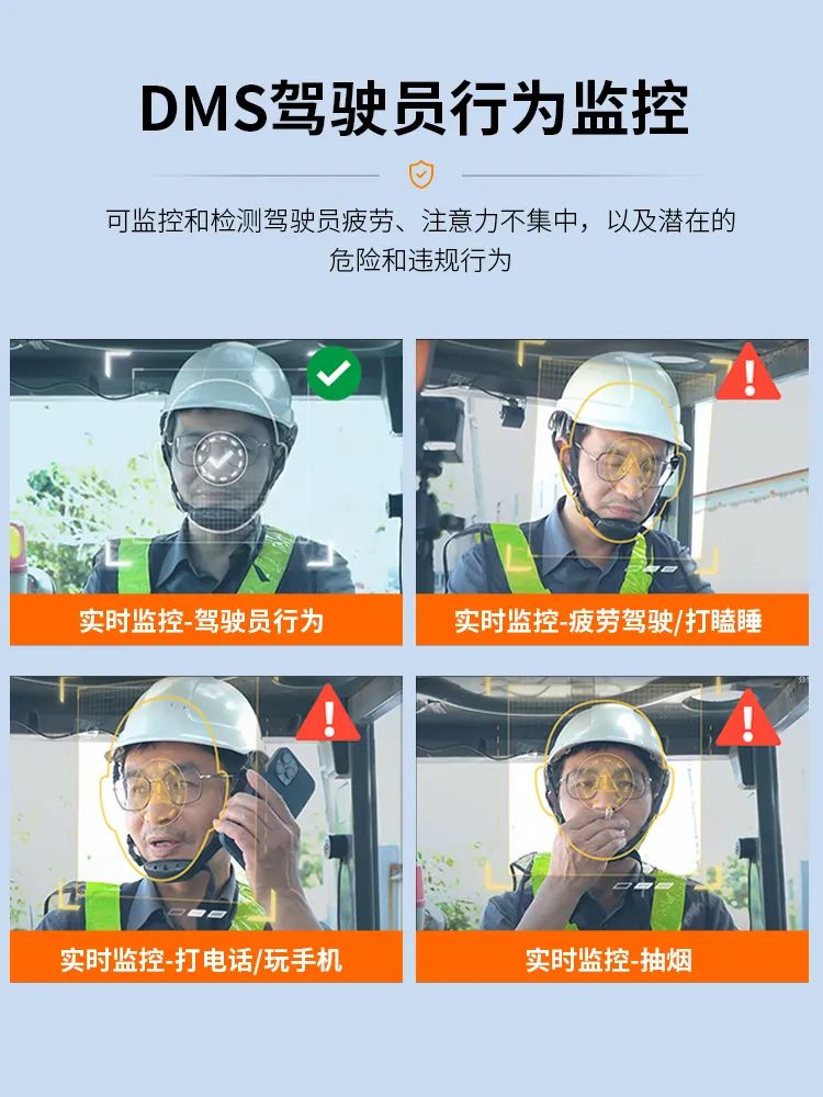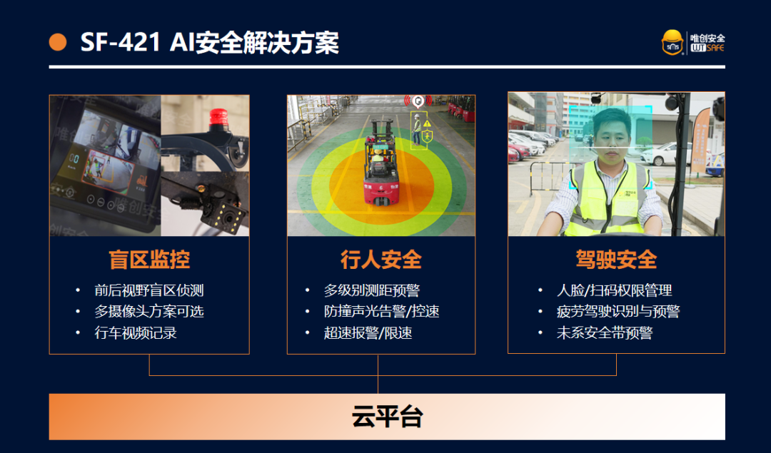 SF-421叉车AI安全解决方案具有AI智能防撞、精准驾驶疲劳识别、授权驾驶、并支持使用车队云管理平台进行车辆的点检管理、告警回溯等优势,可以起到主动防撞、行车记录、人员监控、远程管理多种功能,极大改善厂区搬运安全,提升叉车管理效率。