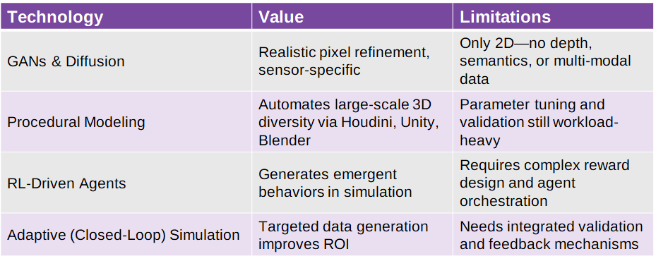尽管面临计算和可扩展性方面的挑战,新一波新兴技术正在重塑合成数据的生成、验证和部署方式。程序化内容生成、学习型模拟器和闭环模拟系统等技术进步,为训练下一代计算机视觉模型提供了更丰富、更可扩展、更领域专用的数据集。