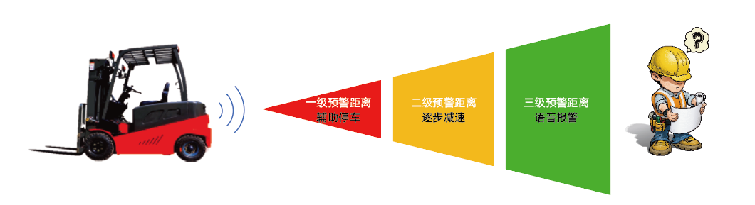 倒车时叉车司机存在视线盲区,嗒上车主动安全预警系统,通过声光报警提醒及辅助停车,达到安全保护作用。适用于人车交汇频繁区域,预防发生人、车、物碰撞而导致的人员伤亡或财产损失。