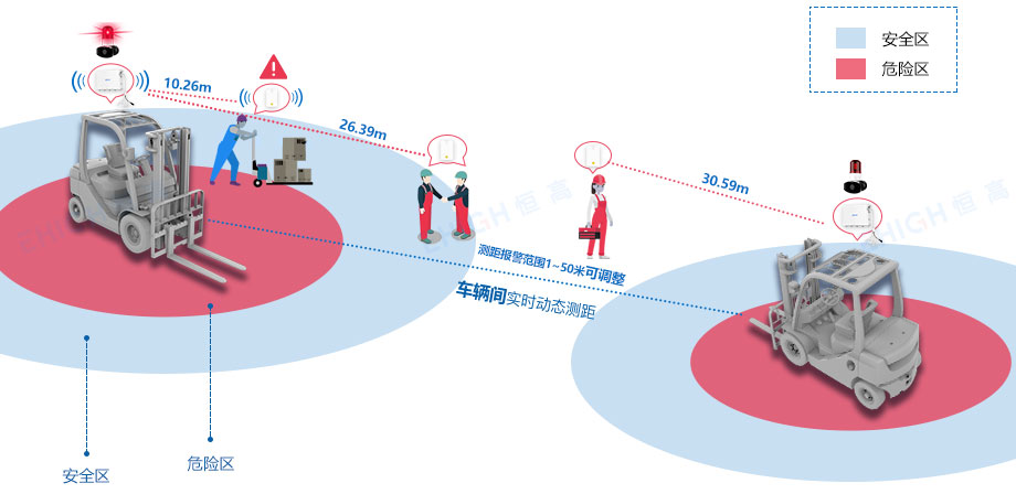 EHIGH恒高叉车防撞系统是基于UWB技术自主开发的一套安全测距系统,精度可达10cm,通过精确测距预警可有效防止叉车事故发生,同时可实时定位人员、车辆的准确位置。该系统还具有容量大、抗多径能力强、功耗低等特点。