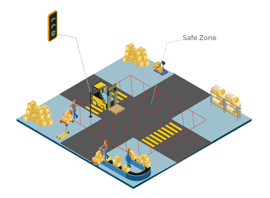 分区系统允许您管理特定区域的叉车活动。例如,可以设置车辆进入危险工作区域时的速度限制。 由于在车辆上和大门附近应用了电子设备,因此可以设置活动以激活标志并管理对某些区域的访问。