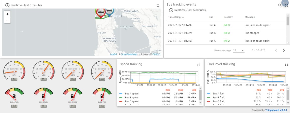 以下托管在实时演示服务器上的交互式仪表板表示可能嵌入在 IoT 车队跟踪项目中的车辆路线和状态指示器可视化。请参阅下面的仪表板说明。