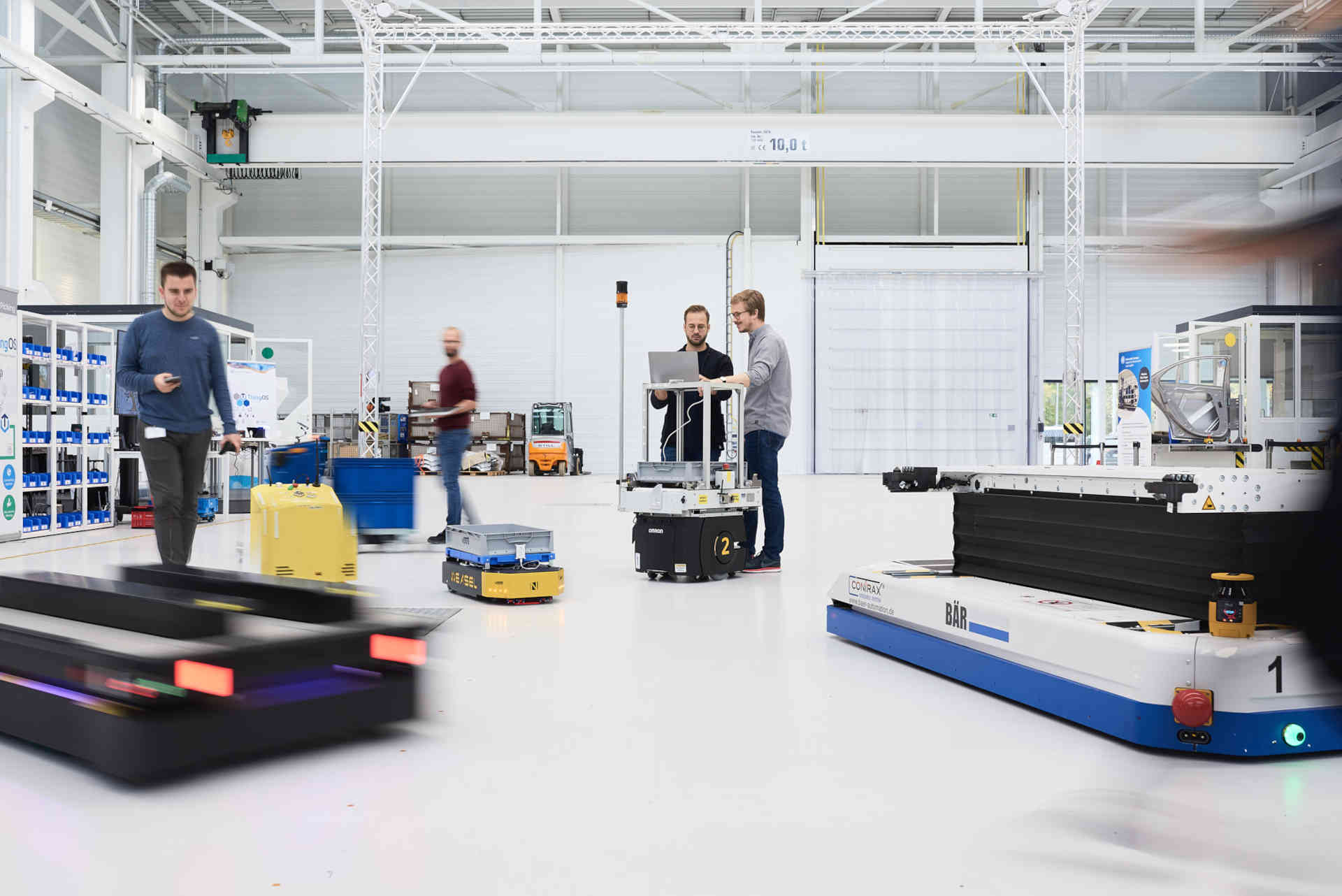 通过使用本地化和通信技术 (NAiSE RTLS),中央软件可以将所有混合操作包括在交通控制中,从而通过避免冲突和瓶颈来提高内部物流交通的效率。