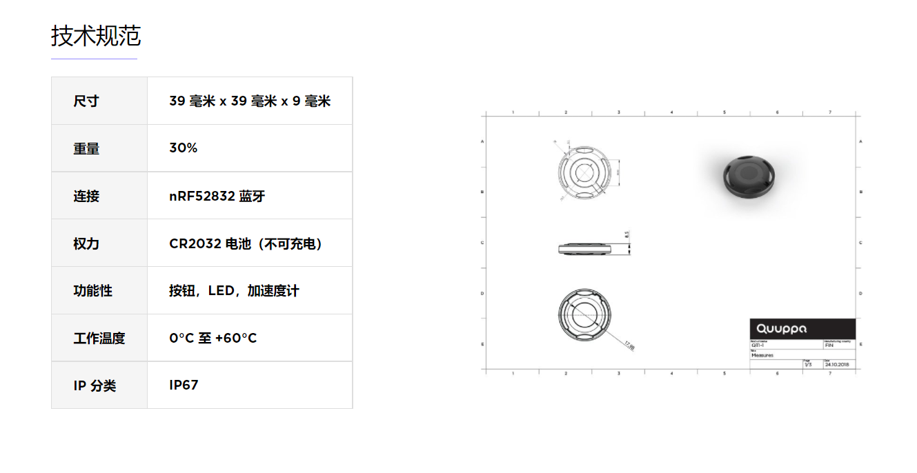 Quuppa QT1-1 标签设计为易于连接到个人或对象。它是轻量级,防水,防震和IP67分类,设有一个3轴加速度计,一个可编程按钮和一个LED。