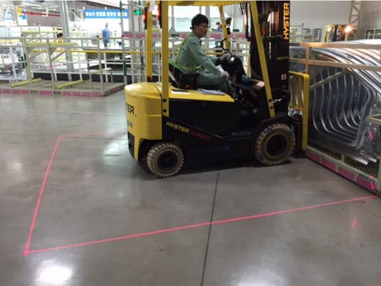 红色区域在叉车附近的地板上放置了一条鲜艳的红线,以显示行人不允许他们进入的地方。它将红色区域投射到地面上,以警告行人和车辆远离危险的工作场所。