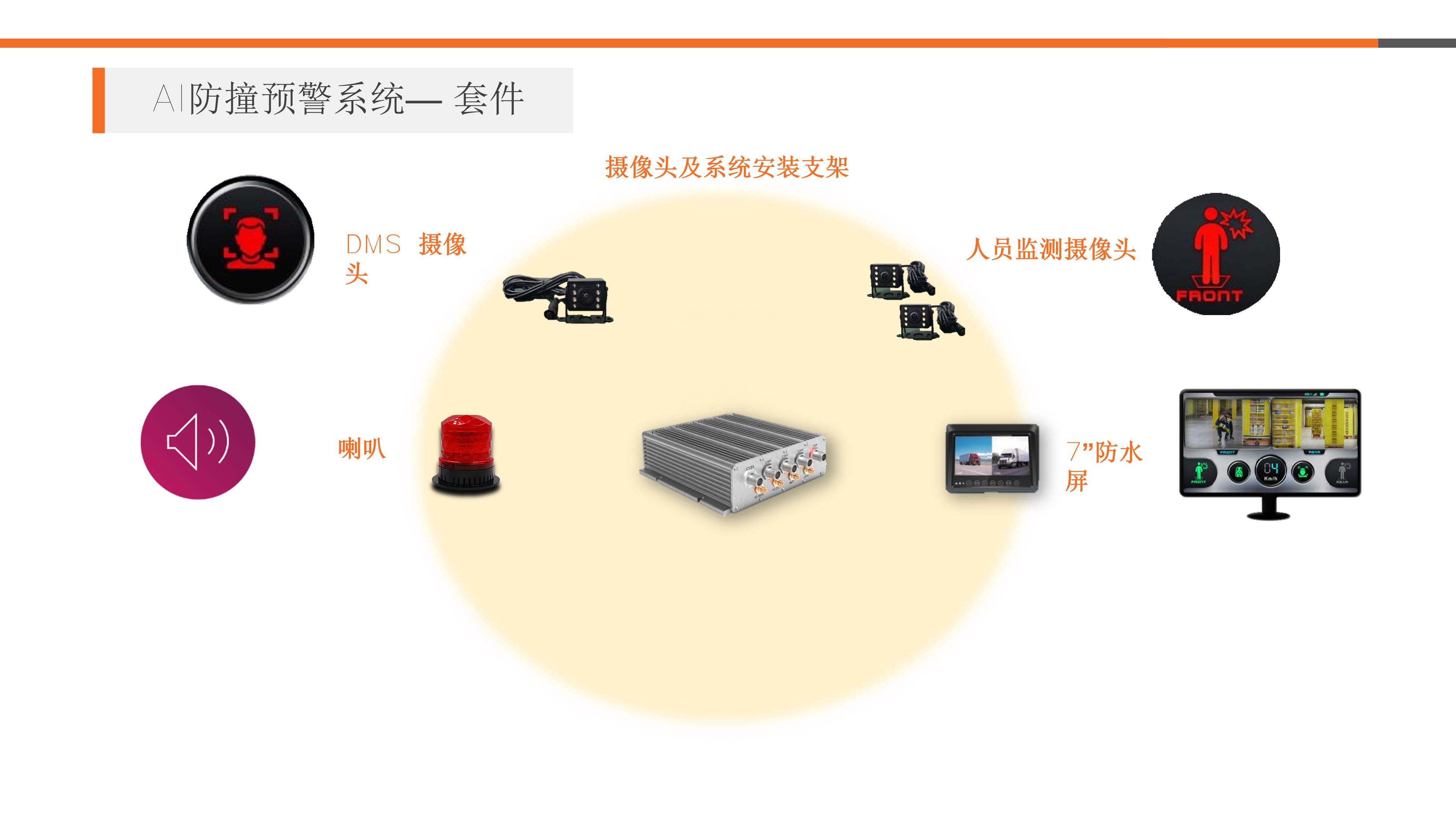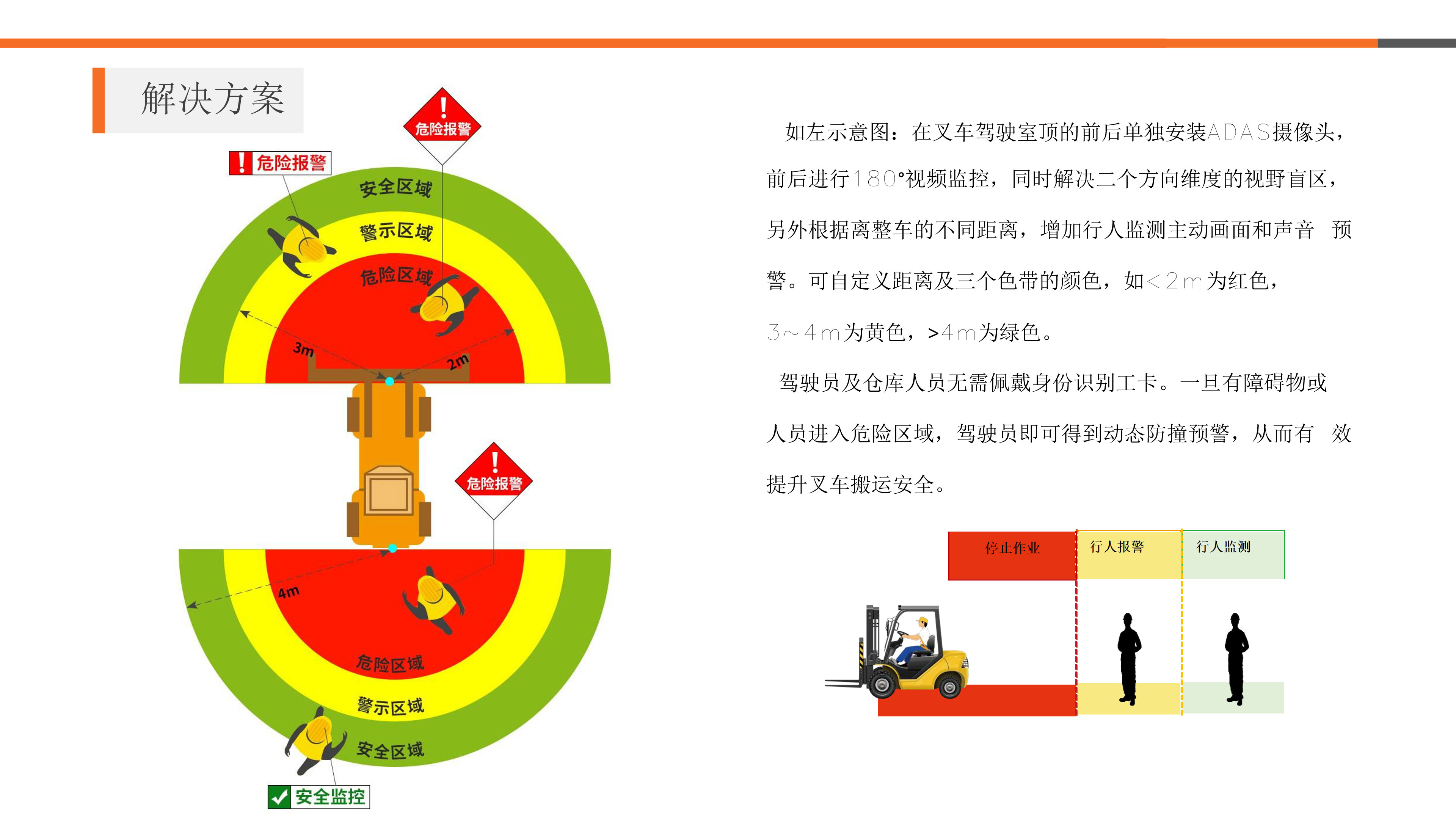 实时车外视频监控及录制,支持2 ~ 6 个独立的高清鱼眼摄像,可自定义距离及三个色带的颜色,危险区域—加强警示音; 警戒区域—显示且报警; 安全区域—显示但不报警;主动探测车身周围移动目标,如行 人监测等驾驶员及仓库人员无需佩戴身份识别工 卡。一旦有障碍物或人员进入危险区域, 驾驶员即可得到动态防撞预警
