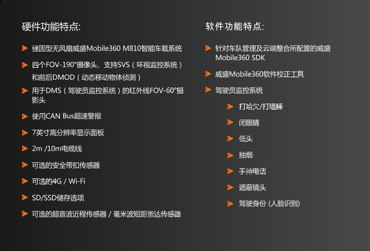 该套件将威盛 Mobile360 M810系统与安装在车辆每个面上的四个摄像头(用于监视周围环境)以及面向驾驶员座位的DMS(驾驶员监视系统)摄像头结合在一起。前置摄像头和后置摄像头还支持动态物体检测(DMOD),该功能通过在车辆潜在危险范围内检测人员和车辆的接近来进一步增强驾驶员的态势感知能力。