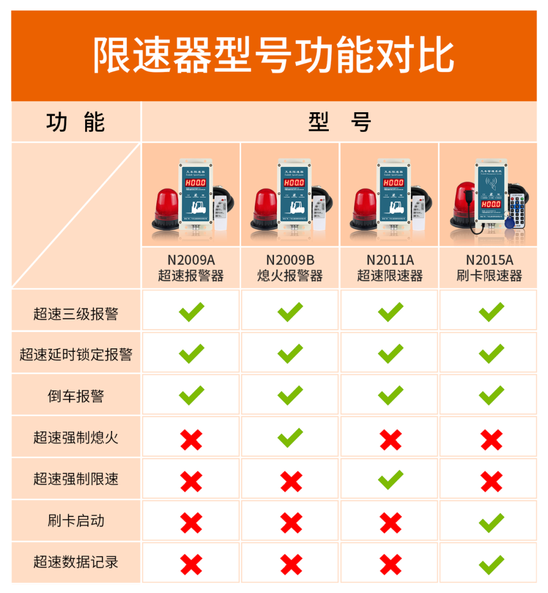 安装N2011A叉车超速限速器能够有效提高叉车司机的工作效率和对安全生产的警觉意识,非叉车驾驶人员可以通过限速器的警示灯和报警喇叭来判断叉车是否超速驾驶,在叉车进出仓库口及限制区域时,自动声光报警,提醒其他员工注意叉车的到来,限速功能型号可以强制车辆降速或者设置为熄火,可参考下图选型: