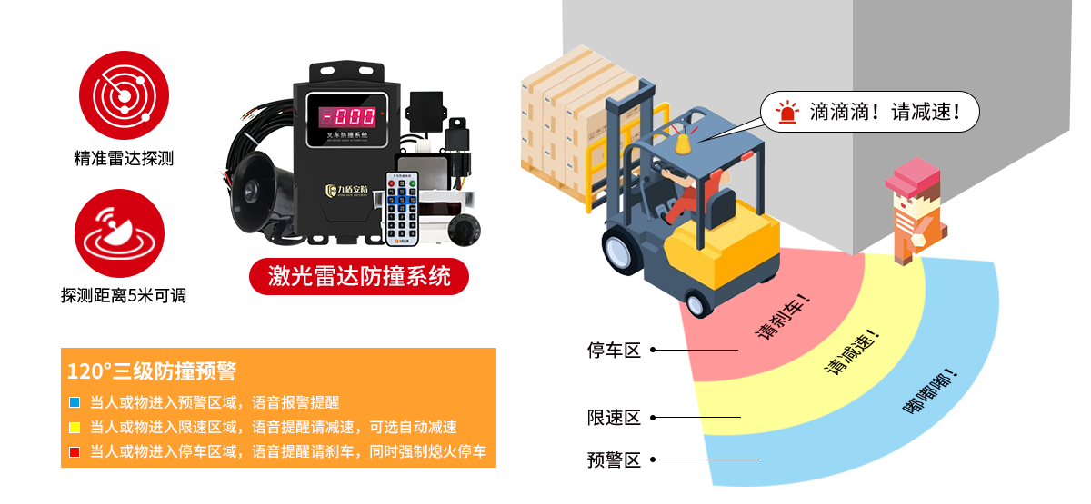 九盾安防叉车防撞系统有效减少叉车因盲区而造成的安全事故,降低安全上的隐患,能够有效提高叉车司机的工作效率和对安全生产的警觉意识,非叉车驾驶人员可以通过防撞系统的报警喇叭来判断叉车是否靠近,探测叉车周边障碍物距离,达到危险距离主动停车,制止事故发生,为企业生命财产带来有效的防护。