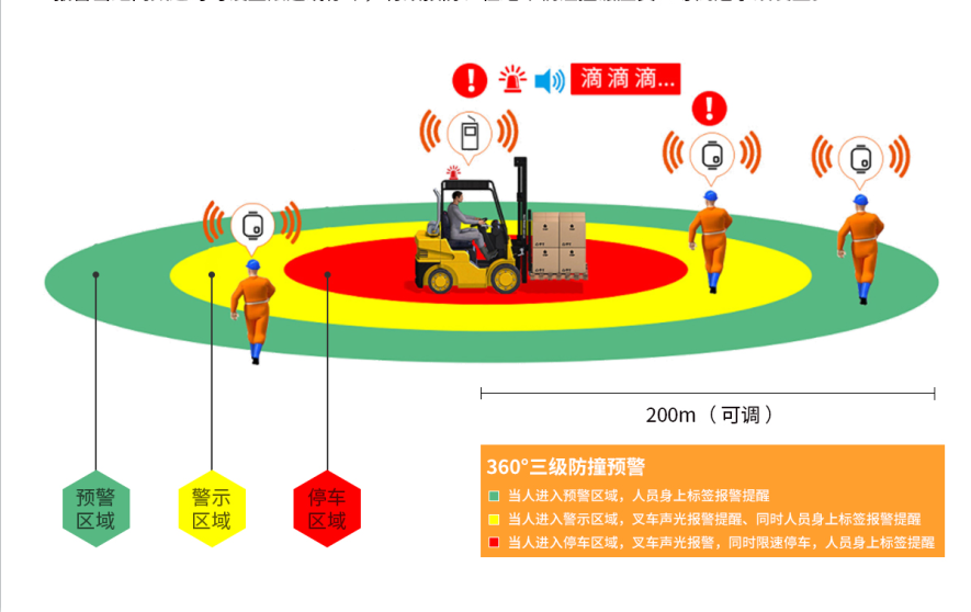 第三,利用UWB技术打造叉车防撞系统。叉车是企业物流的核心,也是货物运输过程中最容易发生事故的地方。而UWB技术可以实现对叉车位置的精准定位,通过设置防撞区域,一旦检测到叉车进入该区域,就会发出警报,提醒驾驶员及时减速或避让,从而有效降低叉车交通事故率。在工厂的环境中,由于叉车后方视线不佳,会对叉车周围的车辆安全带来隐患,而安装九盾安防叉车UWB防撞系统,车辆与车辆之间的精准测距,车辆与车辆之间的行驶距离小于设定的预警距离时,防撞报警灯会根据设定的不同层级的预警距离发出不同报警提示,预防事故的发生,助力安全生产和管理。