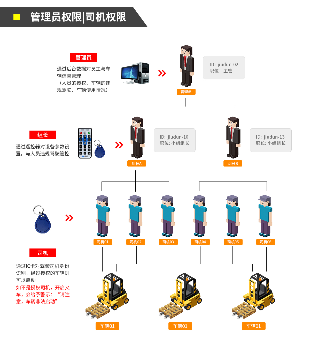 1. 管理清晰可见,每个员工均配备一个IC卡。通过后台对车辆和叉车司机进行信息管理,如车辆使用情况、人员的授权和车辆的违法驾驶行为均可记录在案。