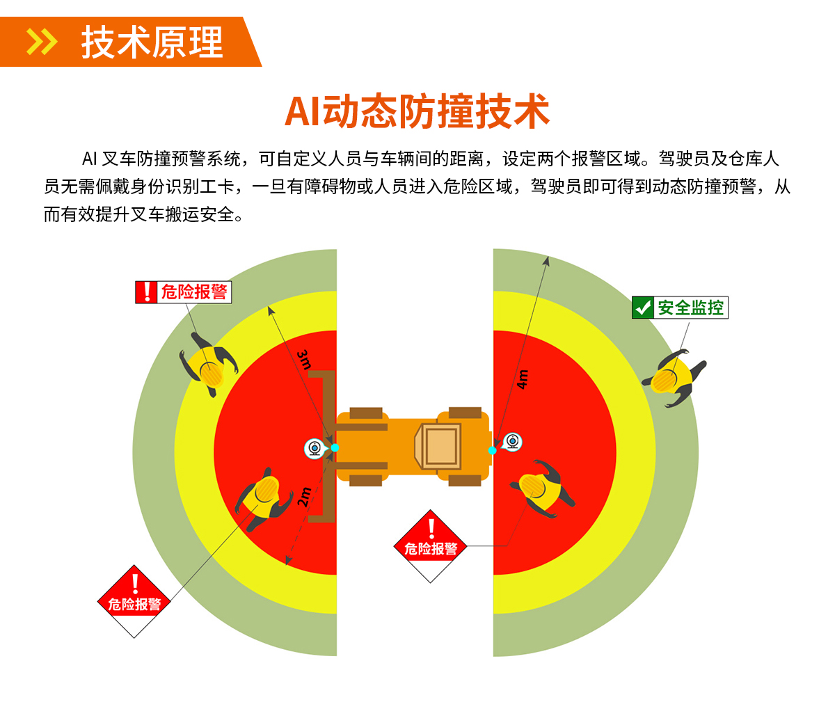 3.动态防撞技术能够实时监测叉车的行驶速度和方向,对可能发生的碰撞进行预警和自动刹车,避免事故的发生。