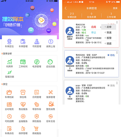 则为企业管理人员提供了移动端的管理工具,包括司机管理、车辆管理、利用率、故障上报、工作时间、启动次数、位置信息、车辆检点、检点记录、保养管理以及维修管理等。而选配功能与WEB端类似,同样具备高度的可定制性。