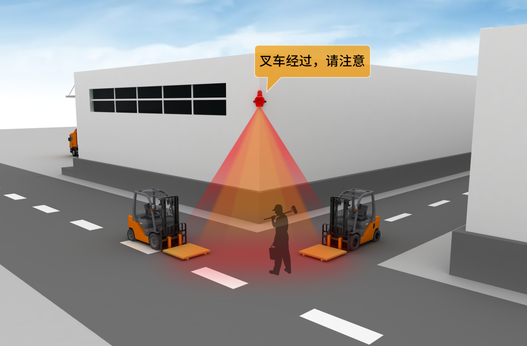 路口防撞以及拐弯处防撞,由于视线遮挡,司机未能及时发现行人的存在,可以通过微波声光报警器感应物体移动,或者UWB定位测距,有叉车经过声光报警提醒注意安全!