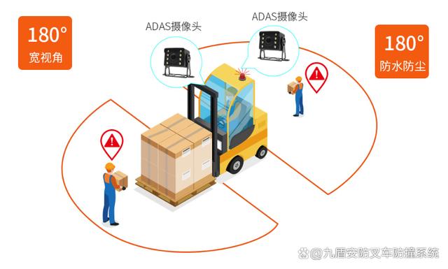 2、ADAS监控摄像头:在车辆护顶架前后方,安装两颗具备不光设计的超广角摄像头(角度达180°让叉车重点监控区域全覆盖,在光线不佳的环境也能够提供人员侦测。