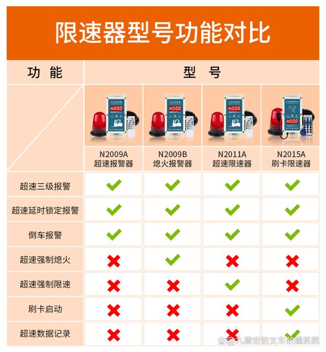 安装叉车超速限速器能够有效提高叉车司机的工作效率和对安全生产的警觉意识,非叉车驾驶人员可以通过限速器的警示灯和报警喇叭来判断叉车是否超速驾驶,在叉车进出仓库口及限制区域时,自动声光报警,提醒其他员工注意叉车的到来,限速功能型号可以强制车辆降速或者设置为熄火,可参考下图选型: