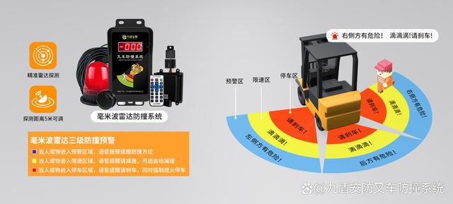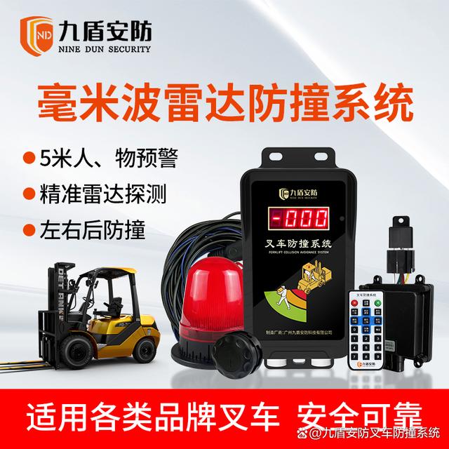 九盾叉车毫米波防撞系统,方案采用毫米波进行探测,实现高精度探测人和物发出不同程度的报警或实现限速+制动管理。叉车作业时雷达开始工作,5米范围内检测到人或物开始报警提醒驾驶员。增加无线测速装置,针对叉车速度进行监测,叉车超速语音报警,防止驾驶员超速驾驶;达到危险距离语音报警请刹车,防止距离过近发生碰撞事故;选配安装油门控制器,超速或者达到限速距离,强制限速;选配安装熄火装置,危险停车的距离强制熄火停车;从而达到以减少因视线盲区导致的事故风险。