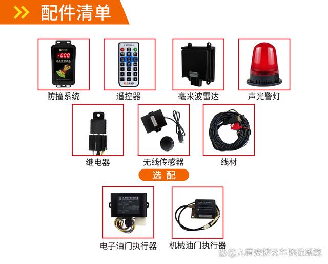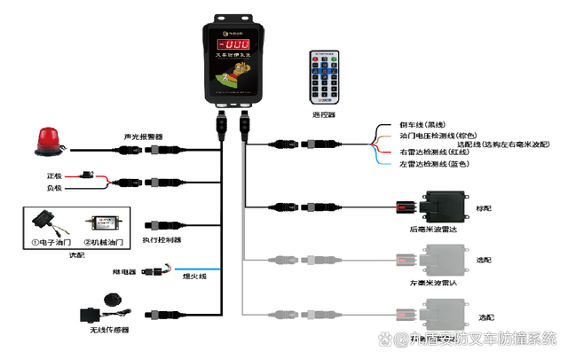 注意:需要左右后三面防撞选3个雷达,只需要倒车一面防撞选1个雷达;用于限速的油门控制器是选配,根据车辆情况分电子油门和机械油门!