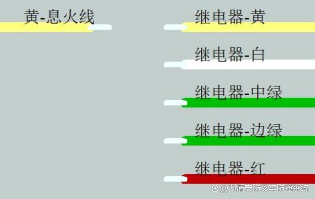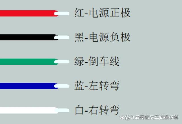 红线接电源 ACC,黑线接电源负极;绿线接倒车线;蓝线接左转向线,自线接右转向线;