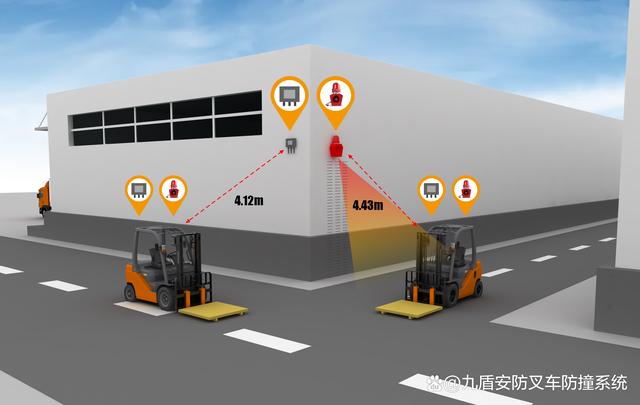 叉车的转向半径相对较大,特别是一些大型或特殊设计的叉车。在转弯时,车头的运动范围可能导致一部分区域成为盲区,驾驶员无法直接观察到。通过安装在叉车上的基站、与人员佩戴标签,实现门口拐角测距防撞方案,帮助驾驶员更好地管理转弯盲区,减少潜在的碰撞风险。
