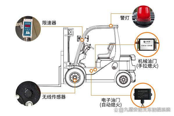 主机建议安装在驾驶室前方,便于驾驶员观察。声光报警器声音可达120dB大音量,遥控设置在10范围以内。注意要安装牢固,走线尽量隐蔽。九盾叉车限速器,为安全计安装限速器!