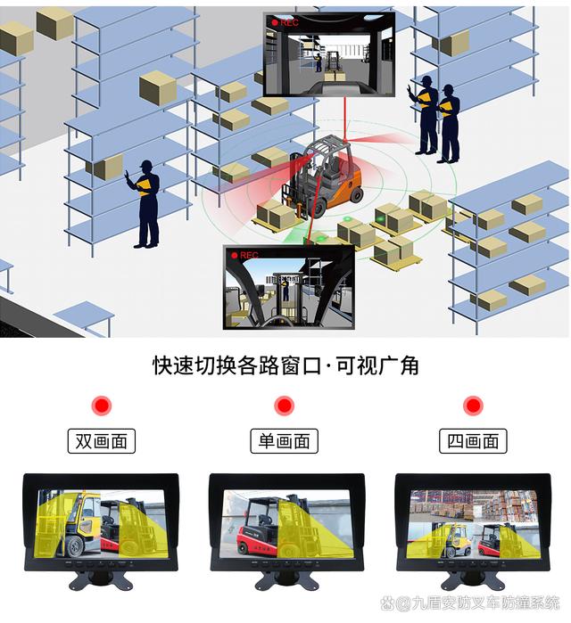 为此,九盾安防专门针对叉车使用环境开发了一套叉车倒车雷达系统——行车盲区监预警一体机。不仅具备倒车影像功能,还具备360度行车记录监控,当盲区感应到行人,能分级报警,辅助驾驶安全防撞!该系统还具有:防水、抗震、抗干扰、耐高温等优势。广泛应用于叉车、消防车、货车、大巴客车等。