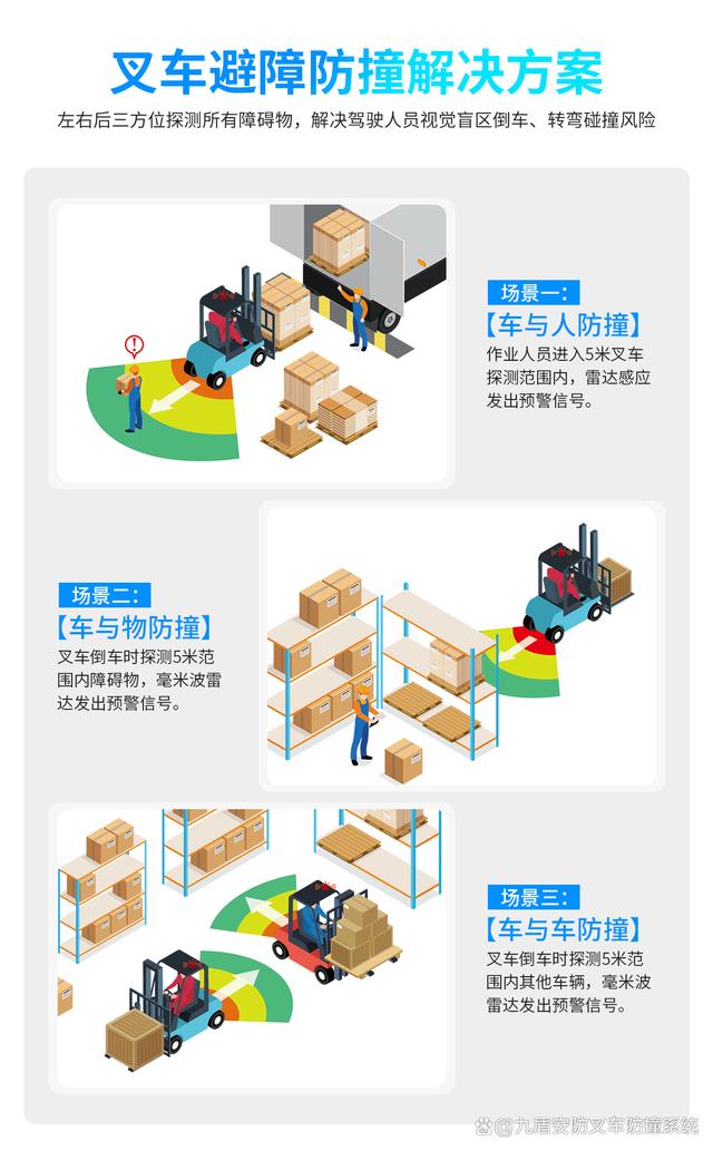 为解决场内倒车盲区所带来的安全隐患,我们提出安装叉车倒车三级防撞预警系统。该系统采用毫米波雷达进行探测,实现高精度探测人和物发出不同程度的报警,分为三级: