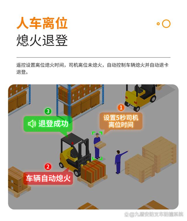 4:离位自动熄火:当驾驶员离开驾驶座并超出安全距离后,系统会自动识别并熄灭发动机。这一设计不仅节约了能源,减少了不必要的排放,还防止了叉车在无人看管时意外启动或移动,进一步增强了仓储环境的安全性。