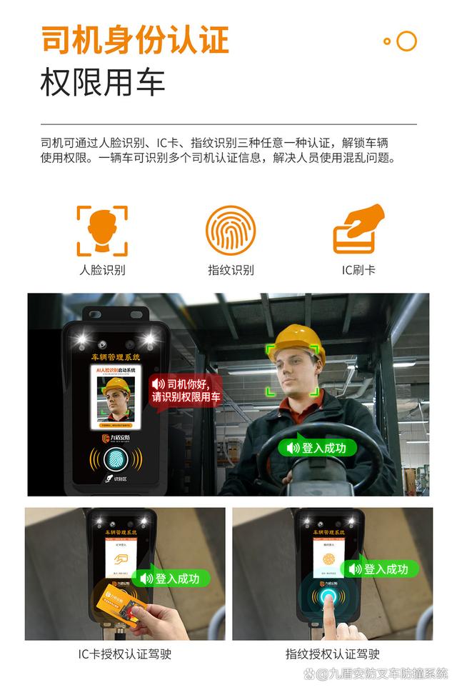 1:人脸识别/指纹/刷卡授权驾驶:操作者必须通过严格的身份验证才能启动叉车,这一举措不仅确保了操作的安全性,还防止了未经授权的人员使用叉车,大大减少了安全事故的发生。
