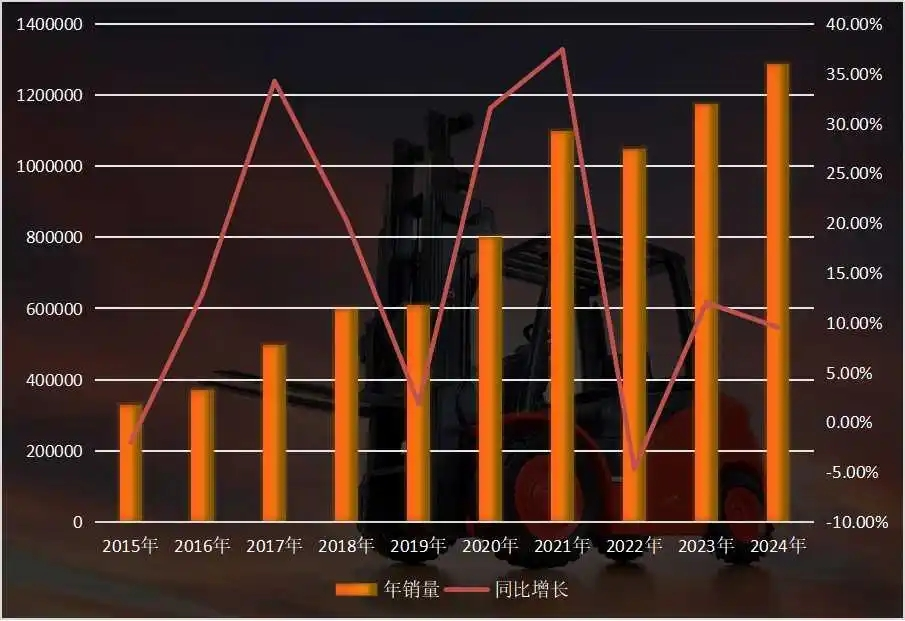 2024年,中国机动工业车辆销量增9.52%,连续4年破百万。出口强劲增18.53%。电动叉车市场占有率升至64%,行业向新能源转型,前景广阔,行业集中度高,双寡头垄断。