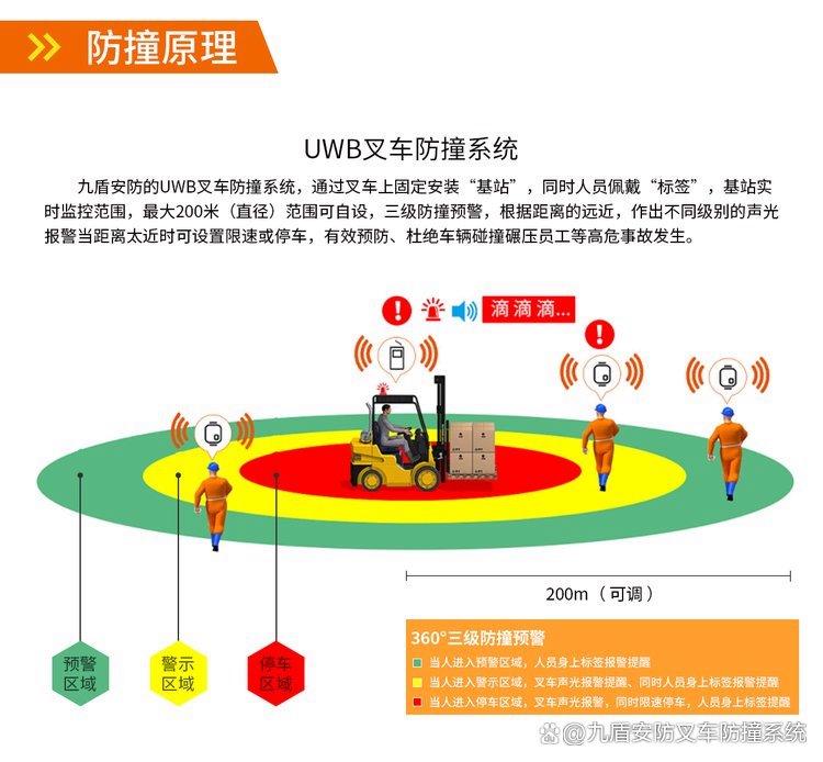 针对纺织行业痛点,广州九盾安防推出的叉车防撞系统,以UWB(超宽带)高精度定位技术为核心,构建安全防护网:通过基站部署,UWB定位策略,通过发送和接收具有纳秒或纳秒级以下的极窄脉冲来传输数据,数据通过定位引擎的算法处理,将精准的位置信息通过开放的API接口传输给上层应用,精准的确认叉车目前所处位置,提醒司机减速慢行,警示行人注意避让,方便叉车管理人进行叉车位置确认。