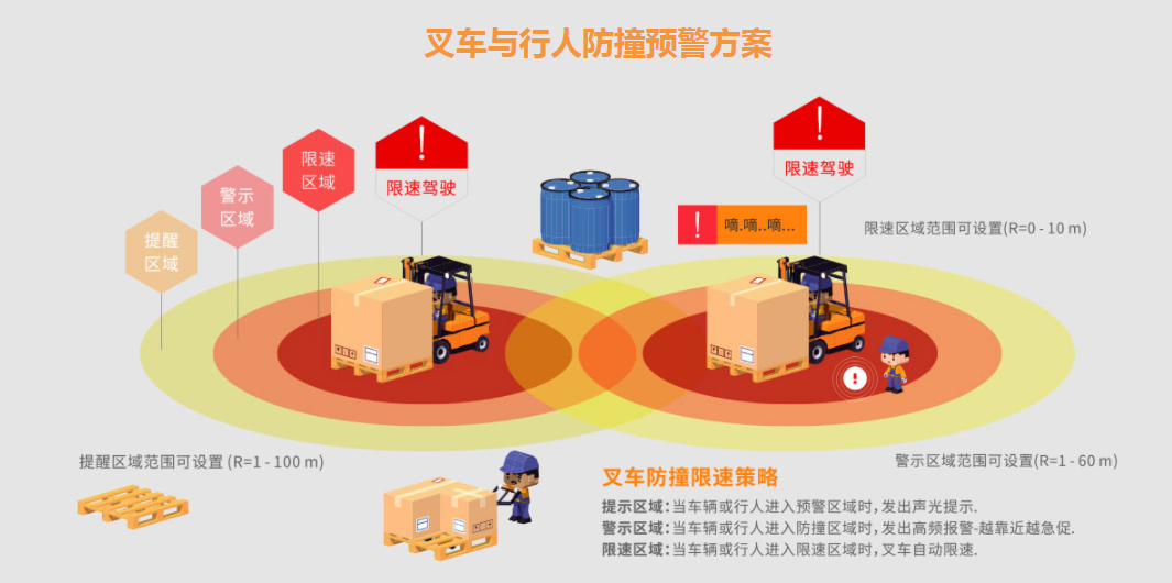 叉车防撞报警系统解决方案,在叉车上固定安装识别基站,同时在进入叉车工作区域的人员佩戴上有源标签,识别基站实时监控4米半径范围内有源标签的相对距离(识别具体可调,最远可识别100米),当人靠近危险范围时,触动叉车上的声光报警器,从而发出声光报警,有效预防、杜绝叉车碰撞员工等高危事故发生,最大限度减少安全事故的发生。